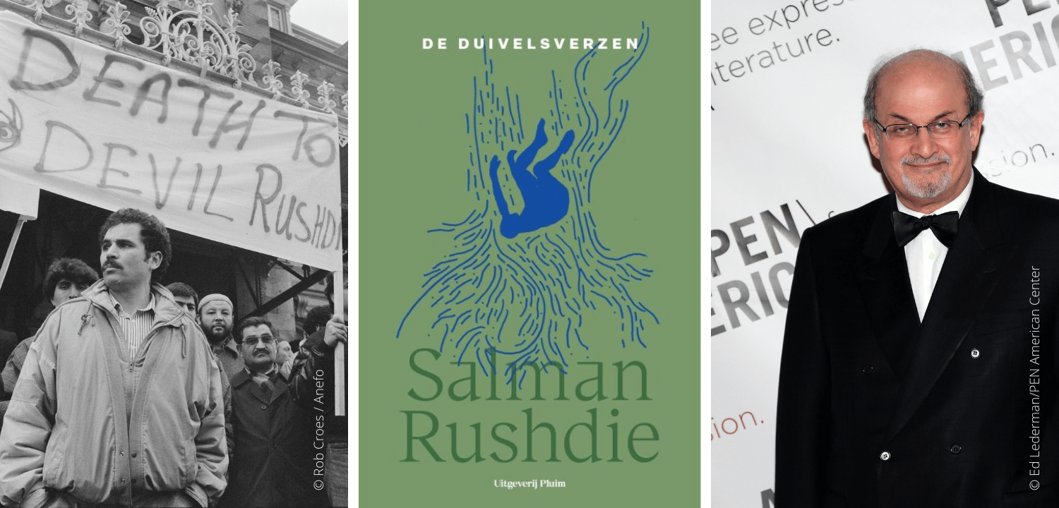 De foto links toont demostranten met spandoek tegen de duivel Rushdie van fotograaf Rob Croes; deze foto komt van Wikimedia Commons. De foto helemaal rechts van Salman Rushdie komt van Flickr en is van fotograaf Ed Lederman voor PEN American Center. De foto in het midden komt van de website van Uitgeverij Pluim.